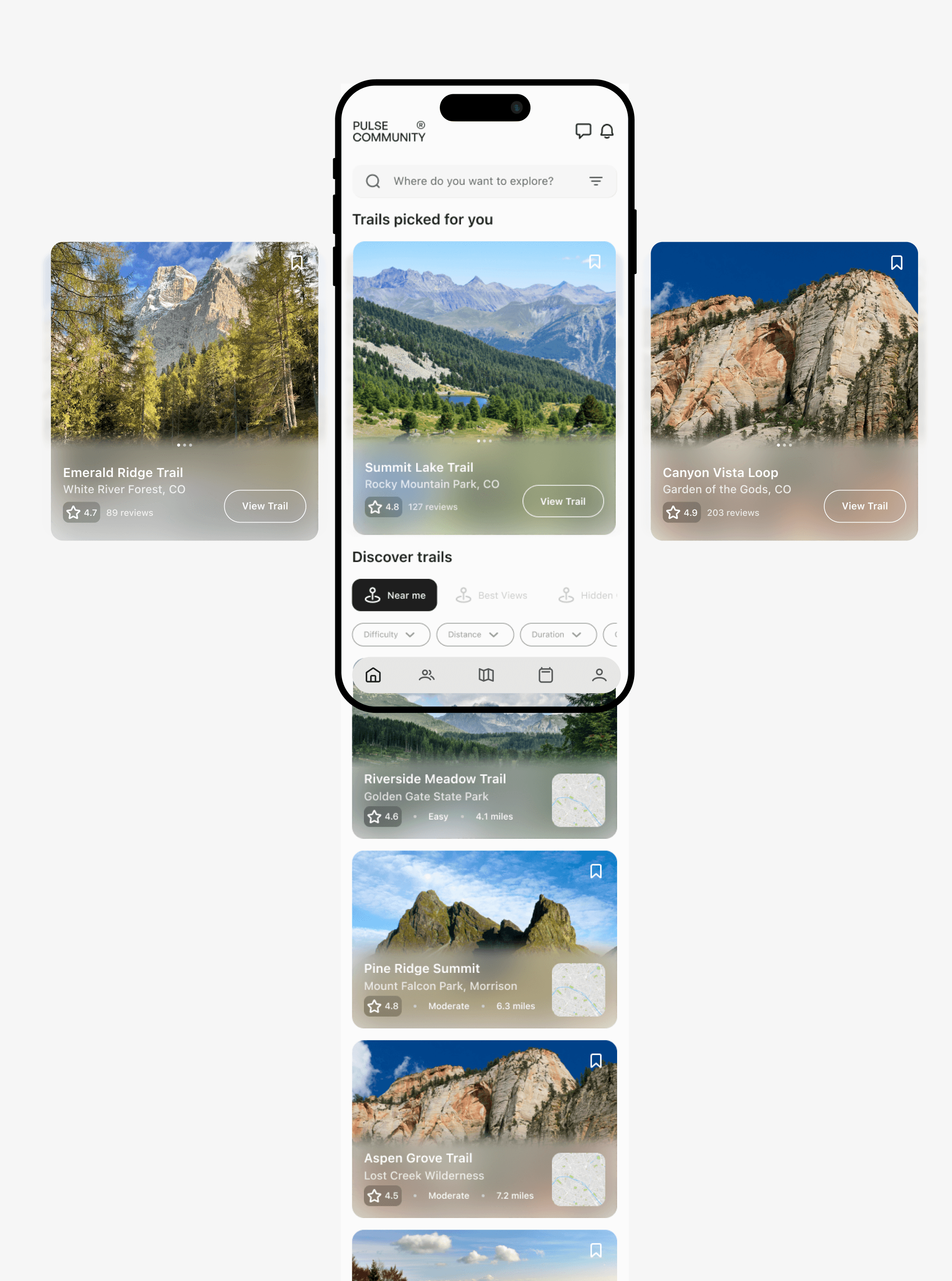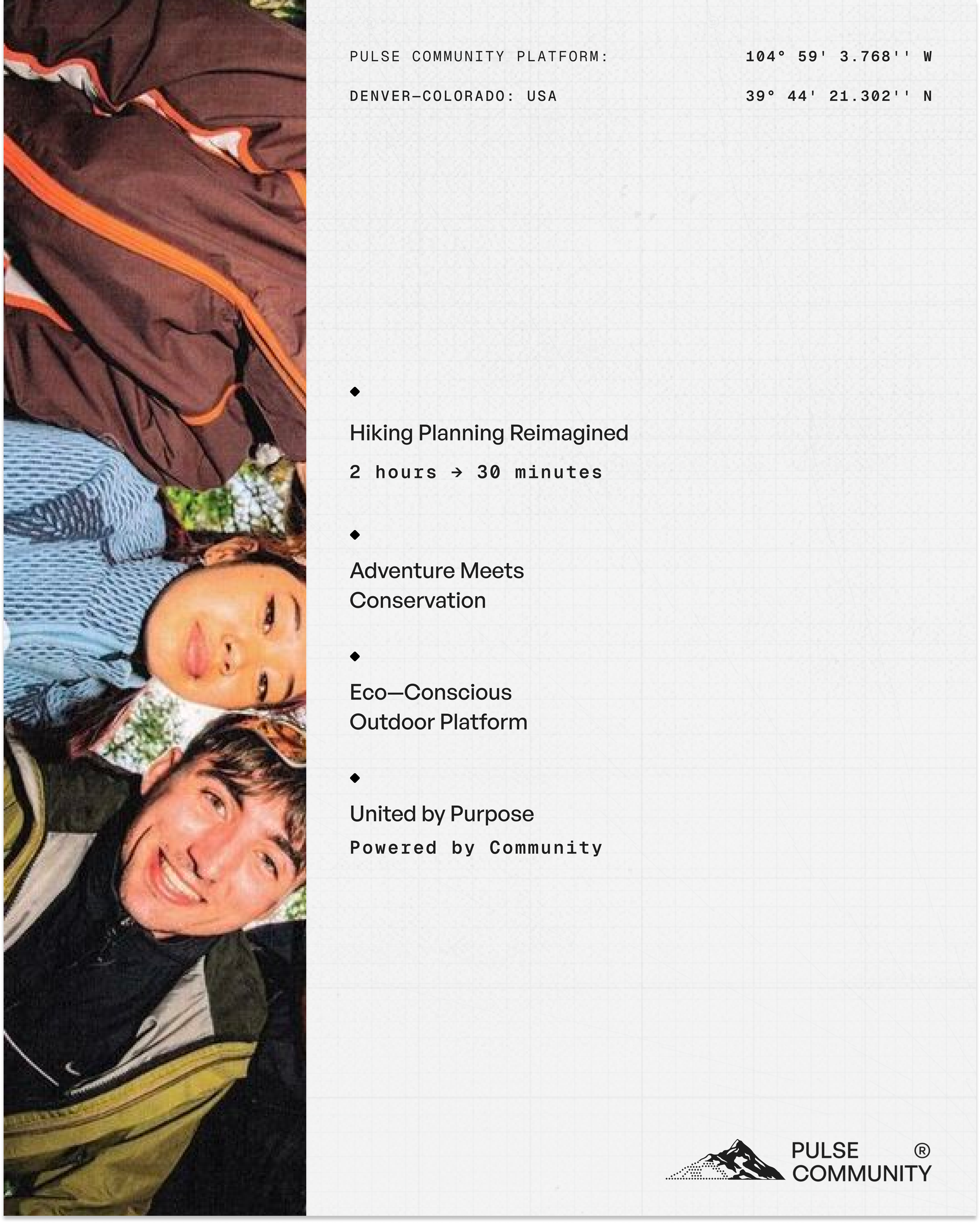 Pulse consolidates everything into one trusted source built around three core ideas. First, visible expertise indicators on every profile — experience level, activity history, helpful vote counts — so you instantly know whose advice matches your skill level. Second, a dual achievement system that celebrates conservation badges alongside adventure badges, making environmental impact feel empowering rather than guilt-inducing. Third, context-aware information architecture that separates casual browsing from active trip planning — the right details appear at the right moment, not all at once. The brand identity needed to feel natural and credible for safety-critical decisions. The visual system — earthy greens, high-contrast typography, thumb-friendly components — was designed for real outdoor conditions: bright sunlight, gloved hands, quick decisions at a trailhead.