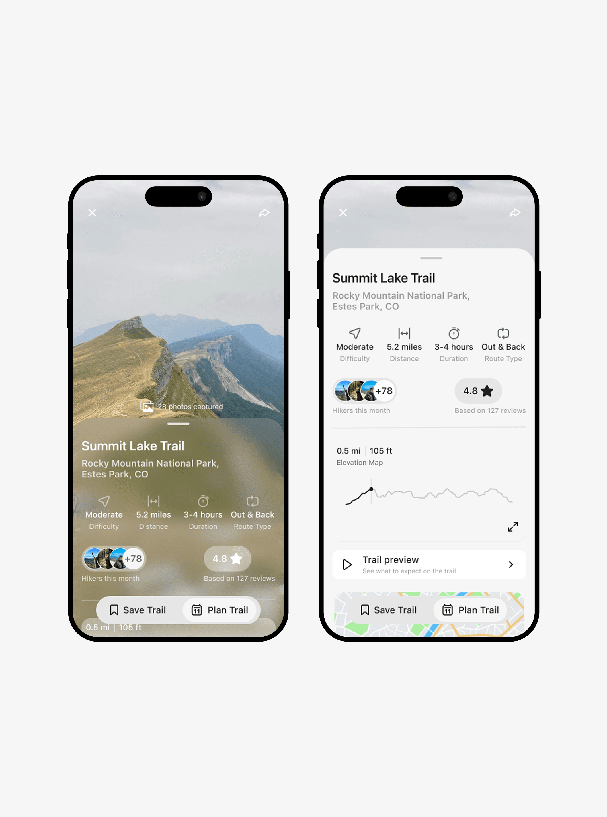 A mobile app for outdoor enthusiasts that consolidates trail planning, real community conditions, and conservation impact tracking into one trusted source — so trip planning feels confident instead of overwhelming.