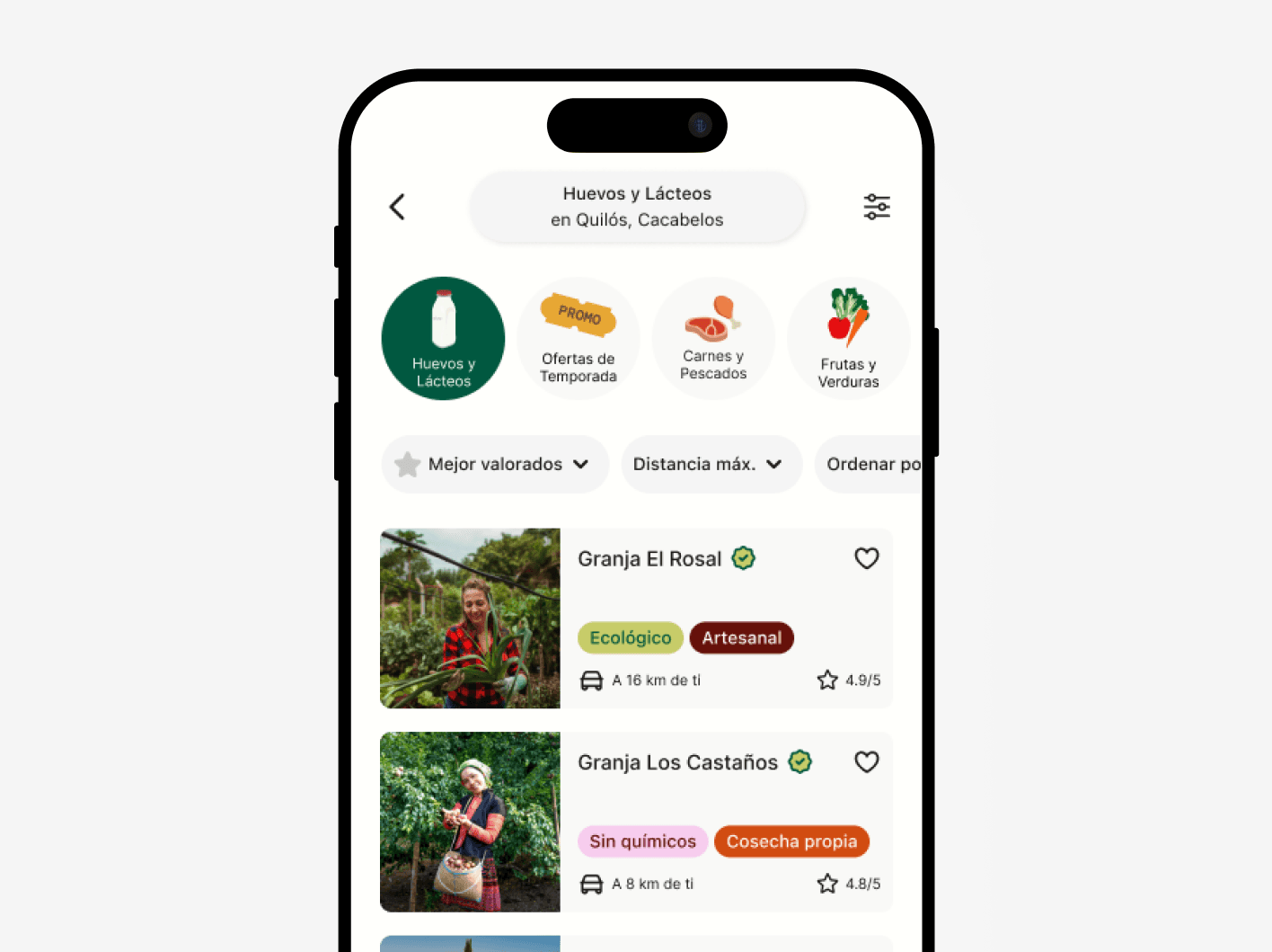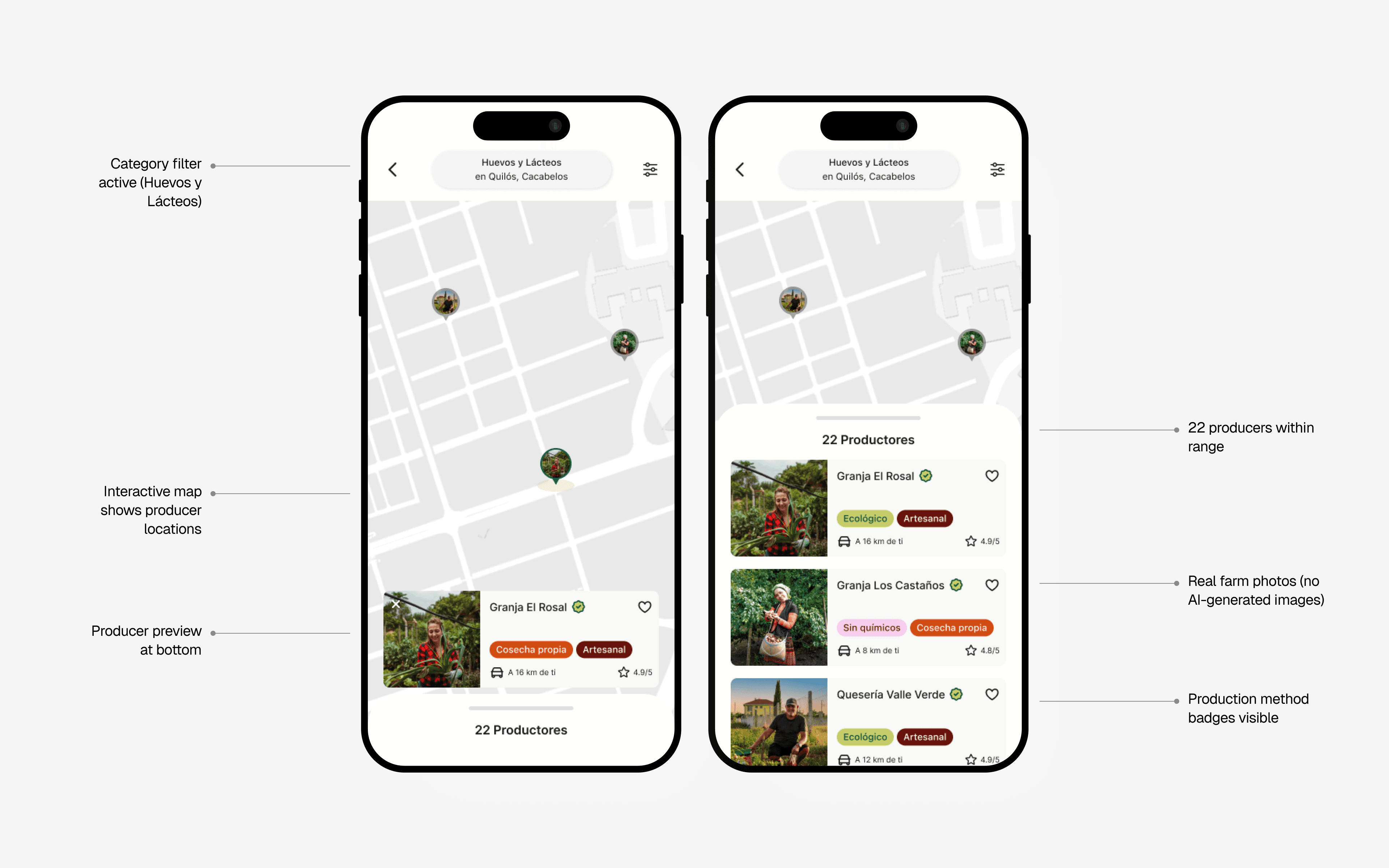 Location based discovery prioritizes producers within 30km radius shown on interactive map. Category filter (Huevos y Lácteos) refines results. Real farm photos, production method badges (Ecológico, Artesanal, Cosecha propia), and distance indicators help users find authentic local products. Map and list views offer flexible discovery—visual exploration or quick scanning.