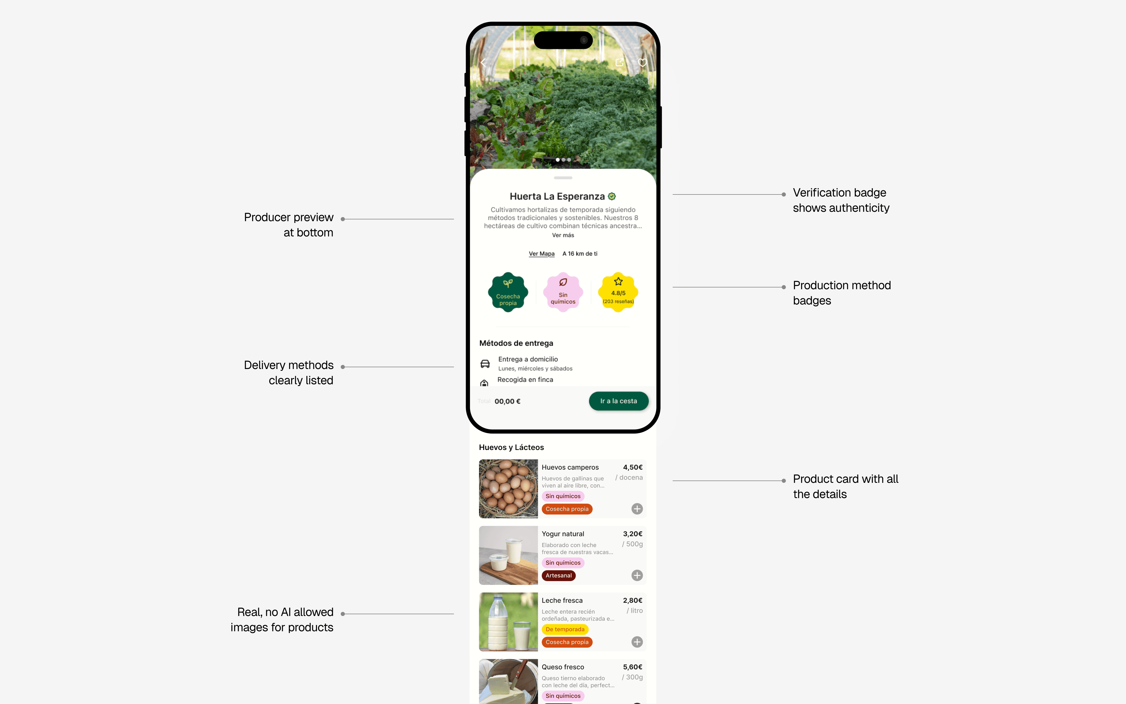 I decided every producer shows verified profiles with real farm photos (no AI-generated images), exact farm location on map, production methods transparently listed, and customer reviews from actual neighbors. Trust isn't built by saying "local quality products"—it's built by showing Miguel's face, his farm location, his free-range chickens, and reviews from people who've bought from him.