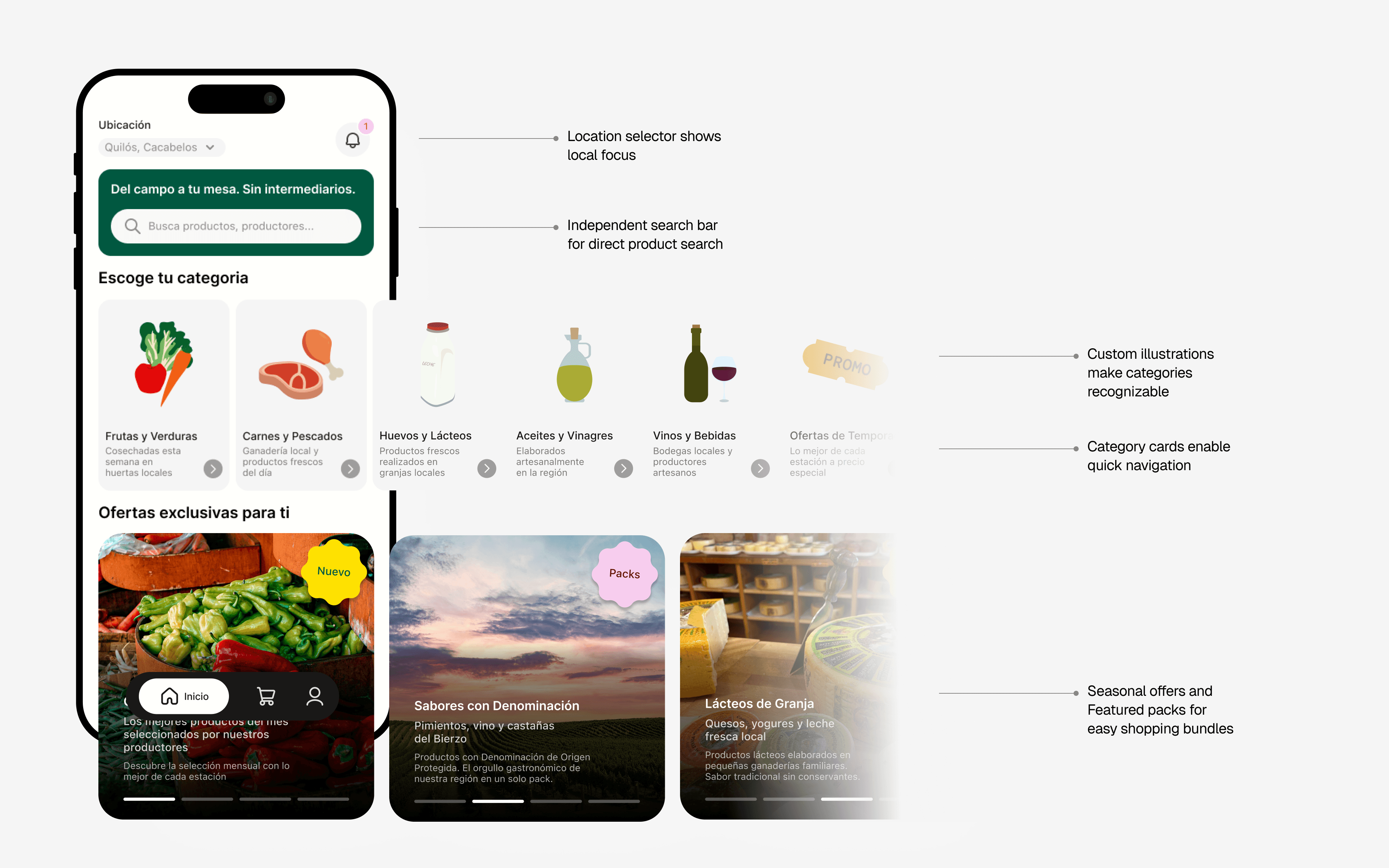 Home screen establishes mission immediately: "Del campo a tu mesa. Sin intermediarios." Custom category illustrations (Frutas y Verduras, Carnes y Pescados, Huevos y Lácteos) match meal planning behavior—browse by ingredient type, not by farm. Location selector shows local focus (Quilós, Cacabelos). Featured seasonal offers and curated packs highlight what's fresh now. This creates familiar grocery shopping patterns while connecting directly to local farms.
